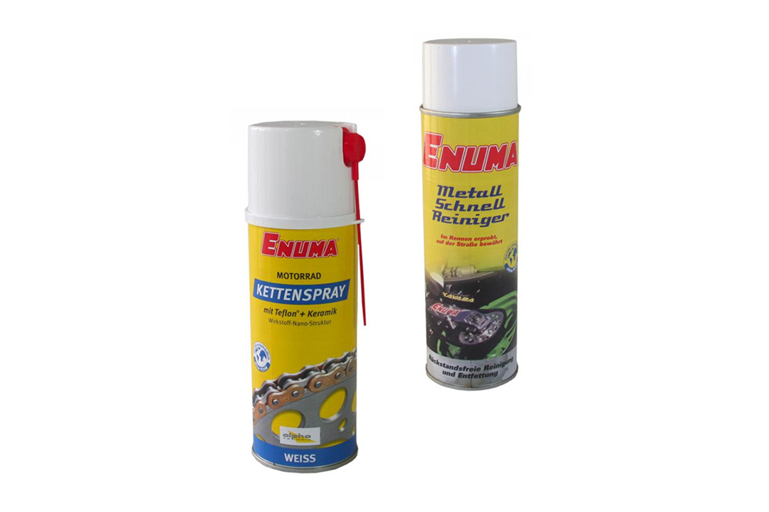 Todo sobre el tema del cuidado de motocicleta: desde el spray para cadena y el limpiador de cadena hasta el limpiador rápido de metales y el paño de microfibra.