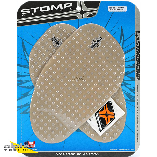 Las almohadillas de tracción Stompgrip se adaptan individualmente a cada motocicleta. Si no hay una almohadilla Stompgrip adecuada disponible, utilice las almohadillas universales Stompgrip o córtelas según sea necesario. Las almohadillas están disponibles en negro o transparente.